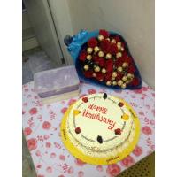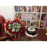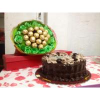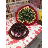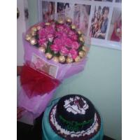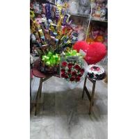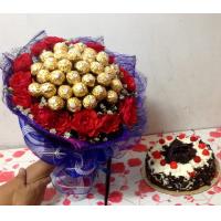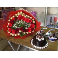 A Heart shape bouquet of 24 red roses with 32 ferrero rocher chocolates with twin small bear with i love you on it as the ribbon.