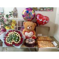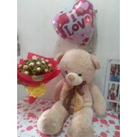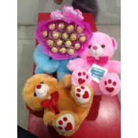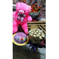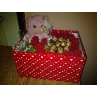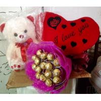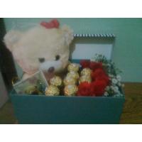 12's red roses, 16's ferrero chocolates and small bear in a box