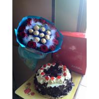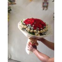 6's red roses, 8's ferrero chocolates and small bear in a box