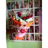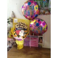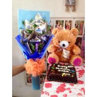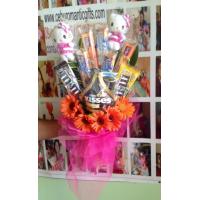 A bouquet of 6 Gerberas flowers , 2 hello kitty stuffed toy, and chocolates (2 M&Ms , 1 Hersheys Kisses, 3 Maxcrunch bar and 2 Tango bar )