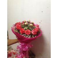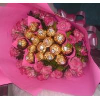 A round bouquet of 10 ferrero rocher chocolates rounded by 18 pink roses