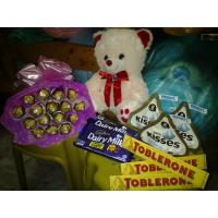 Medium bear, 5 cadburry+5x100g toblerone+ 4 snickers+3 m&m's, +5's hersheys in basket
