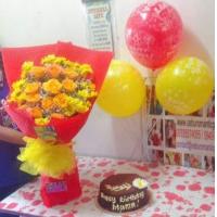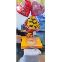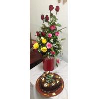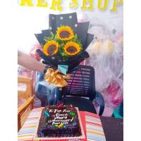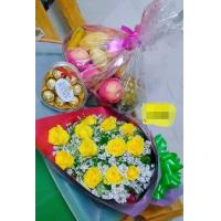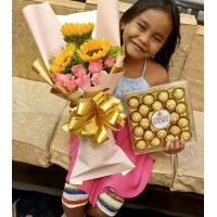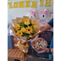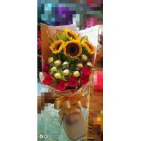 a bouquet of 4 sunflower, 10 ferrero chocolates and 6 red roses