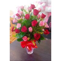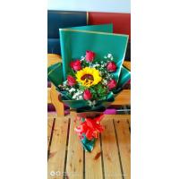 A bouquet of 12 red and pink roses with 4 sunflower,