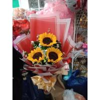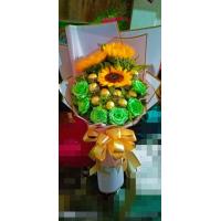 a bouquet of 3 sunflower with 10 ferrero chocolates and 6 green roses